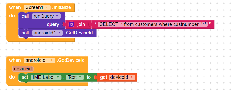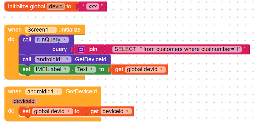 if you need the device id before running the query, then use a clock component in Screen.Initailize to get the device id a little bit later (try 1000 ms) like this