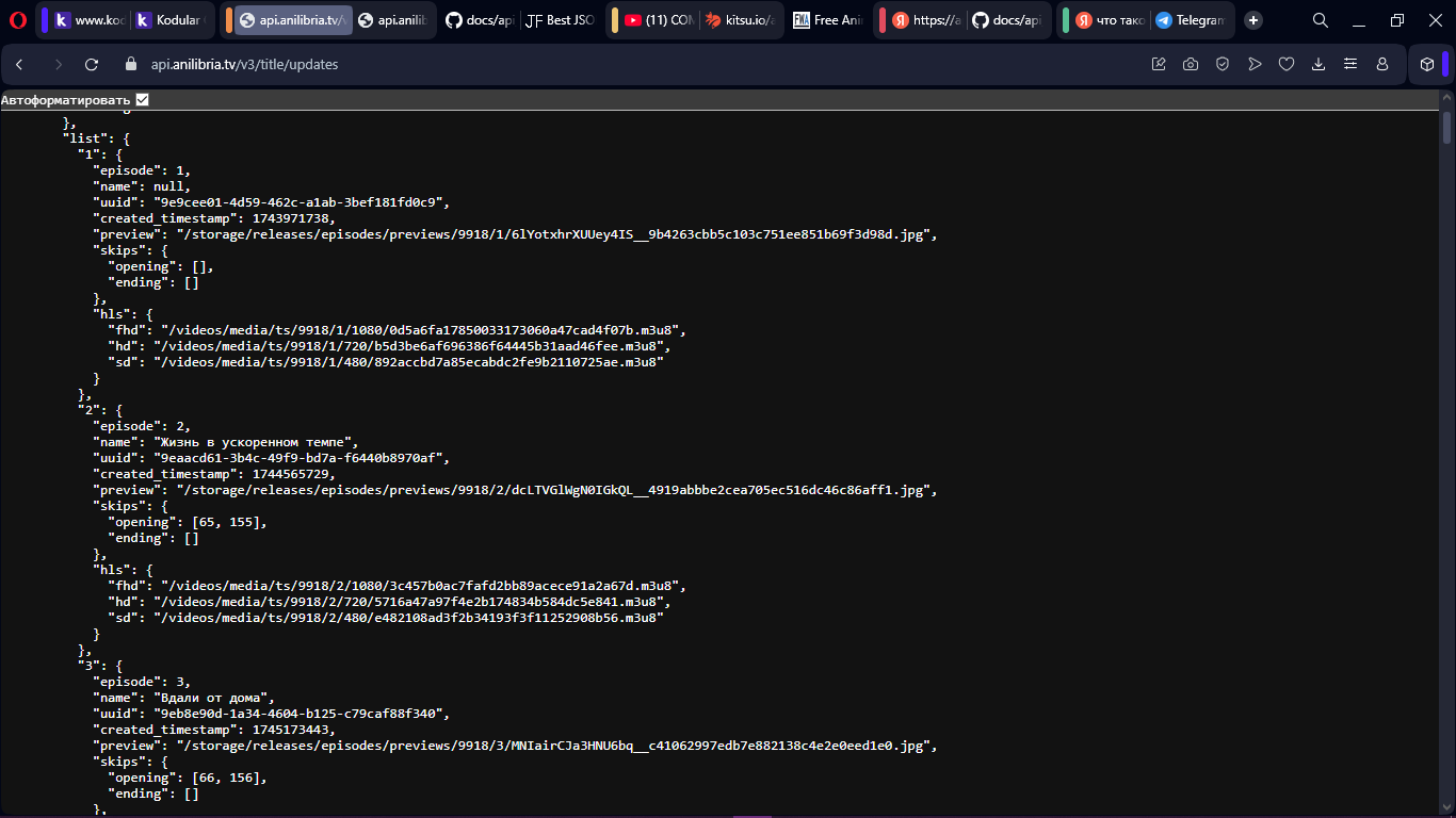 If it would be more convenient for you, here is another Git.hub docs/api_v3.md at master · anilibria/docs · GitHub