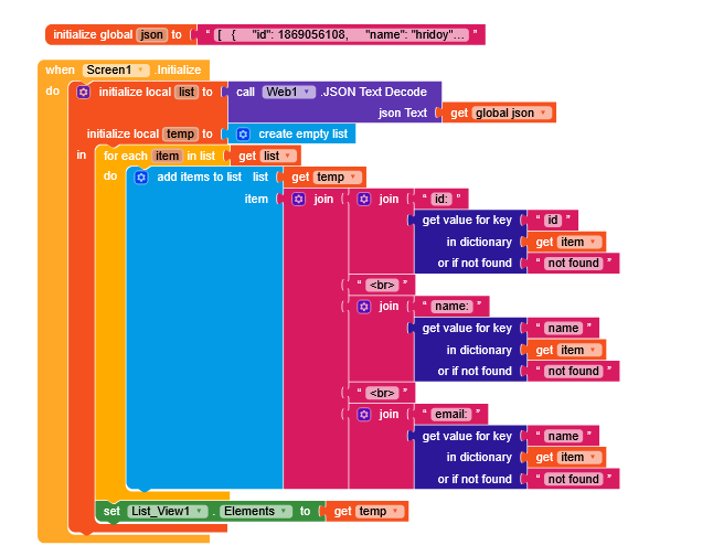 A visual block-based programming code snippet for decoding JSON data and populating a list view with formatted ID, name, and email values when a screen initializes. (Captioned by AI)