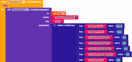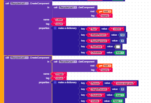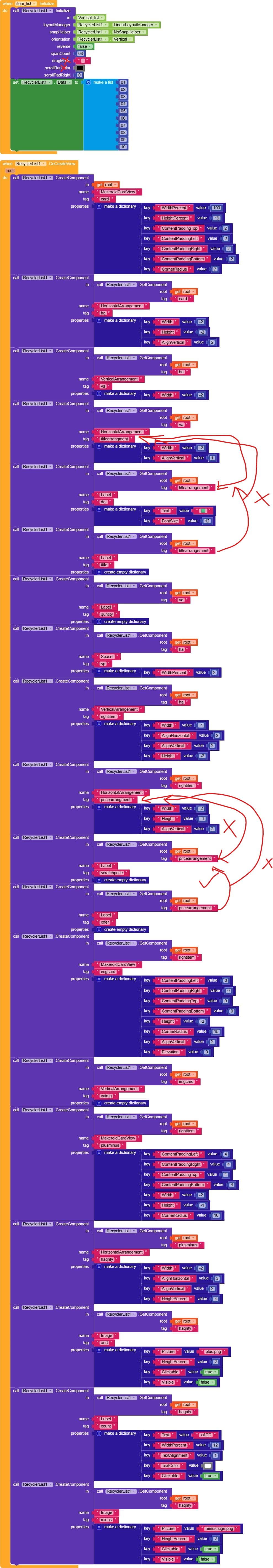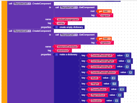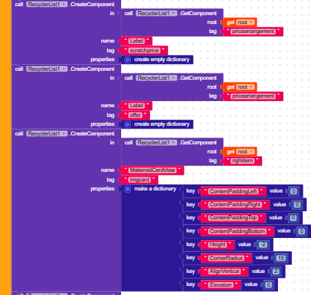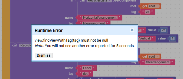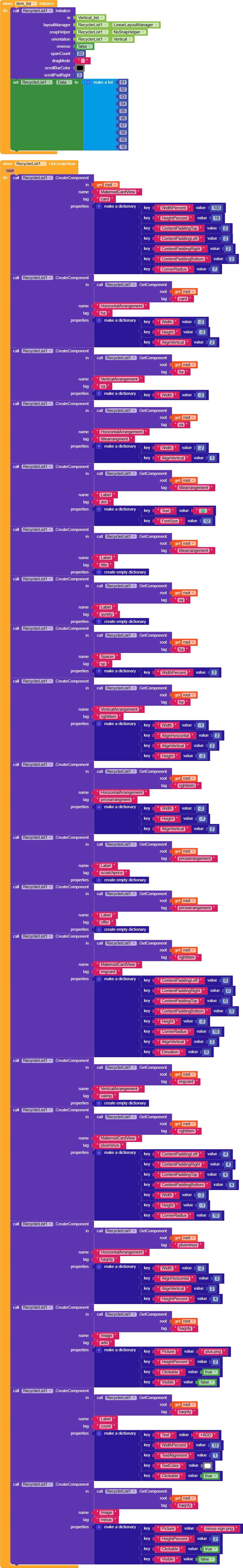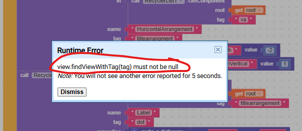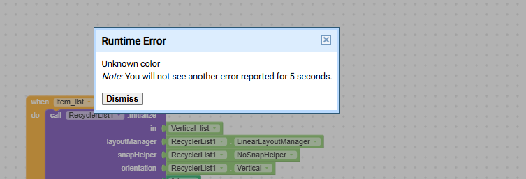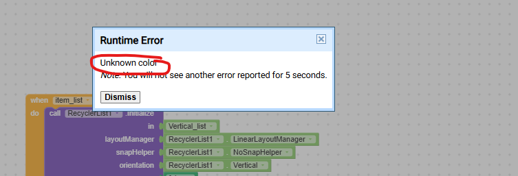 Here is the full code regarding my Recycler ListView. I have checked the dictionary properties and removed any text blocks used for colors, but the “Unknown color” error still appears when I initialize the list. Any idea what is causing this?