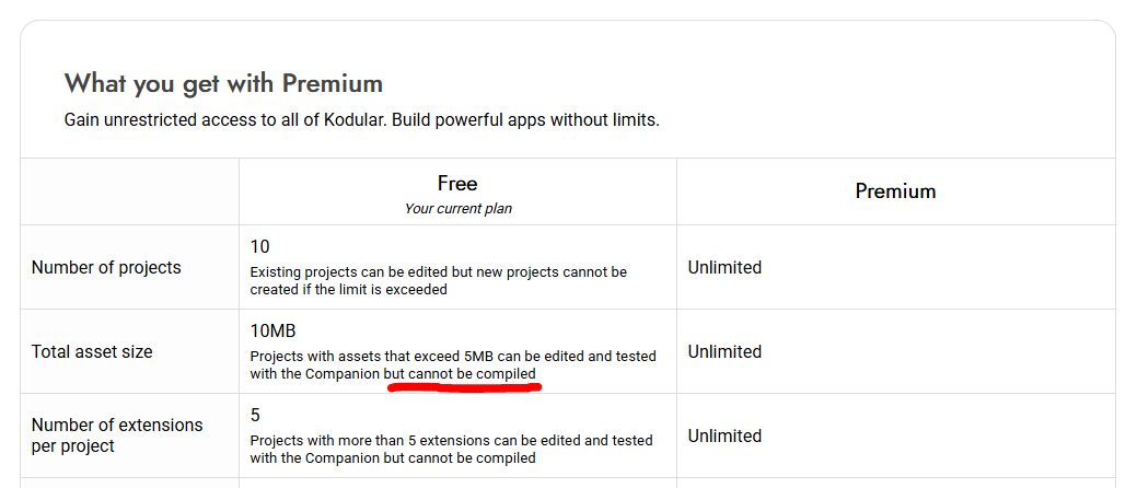 No, the free version allows you to upload assets larger than 15MB, but it doesn’t let you compile the APK.