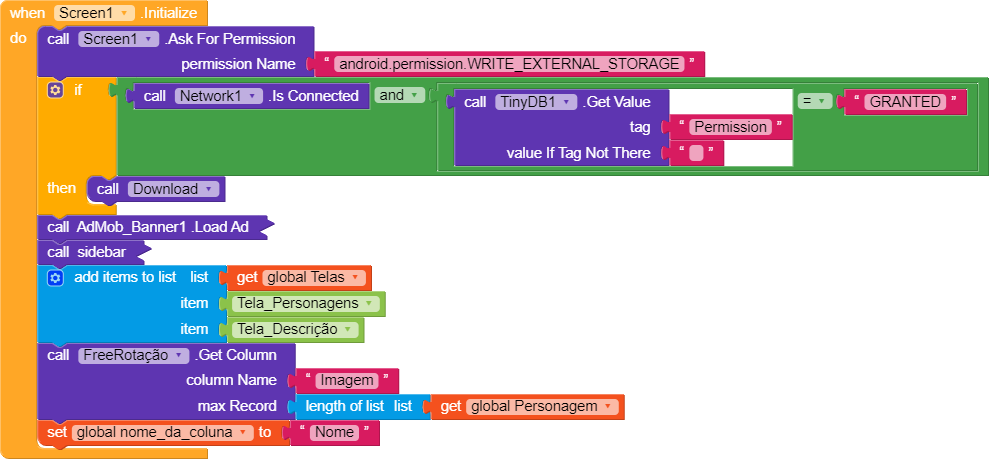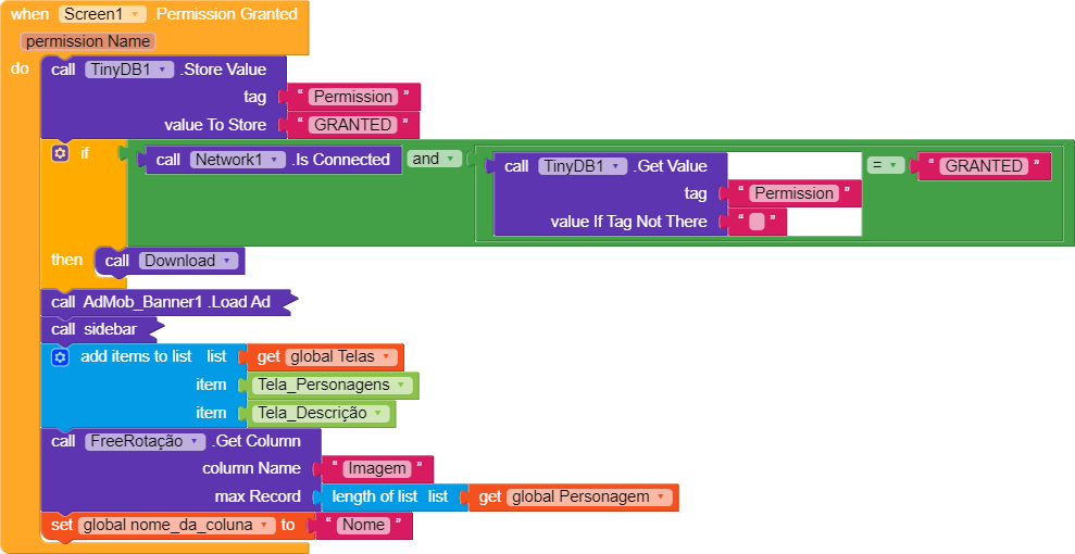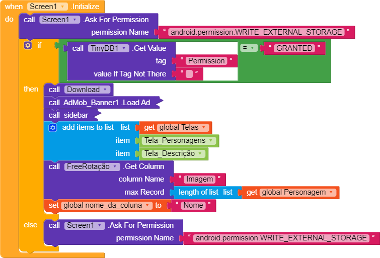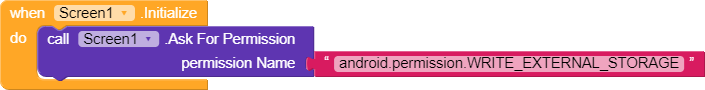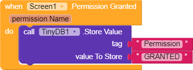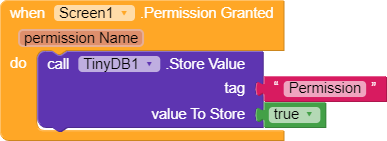 Ok now do one more thing in your screen initializing use a if then condition check if tinydb value = “GRANTED” then copy all blocks from permission granted except tinydb store Value and paste inside it and else ask for permission then it should work try it and don’t remove the blocks from if permission granted