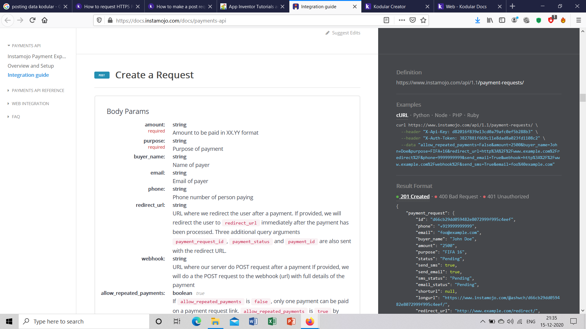 How can I pass on url, api key and auth token (headers) using terminal extension? What is â-Fâ in the curl? Instamojo website hasnât given any example like that? I really canât understand⌠Iâve been trying for the past two days⌠So I donât have to use web component? I have to use the terminal extension? Can you please,please just tell how to create the request (please look at the screenshot)? Please it would be really helpful if you let me know how to do this properlyâŚ