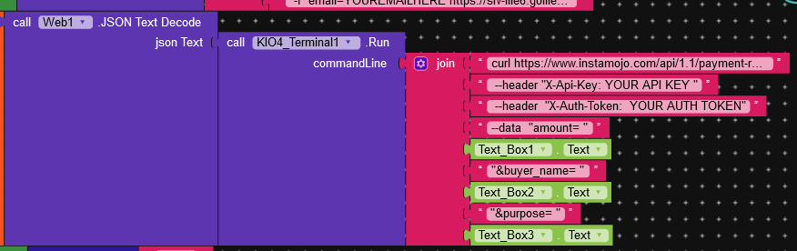I did look at the aia file. It uses a different format than what is given in the docs of Instamojo. For example, what is -F used in that curl command in the aia?
