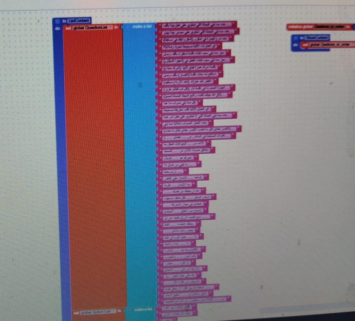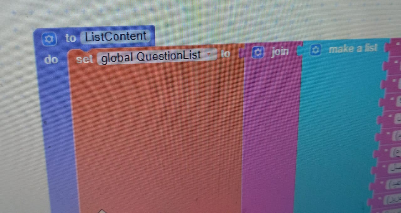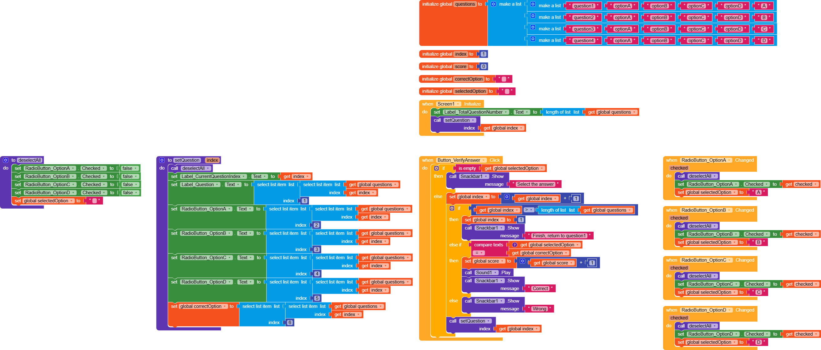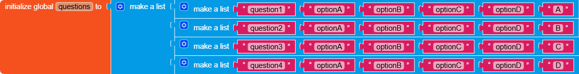 Here is an image of some of the blocks I made. I created lists for the questions, the four options, and the correct answer, all structured like these.