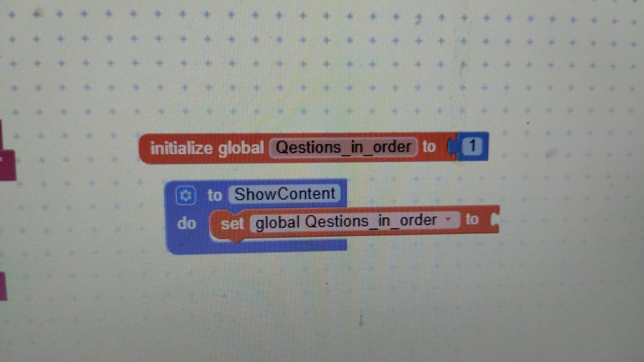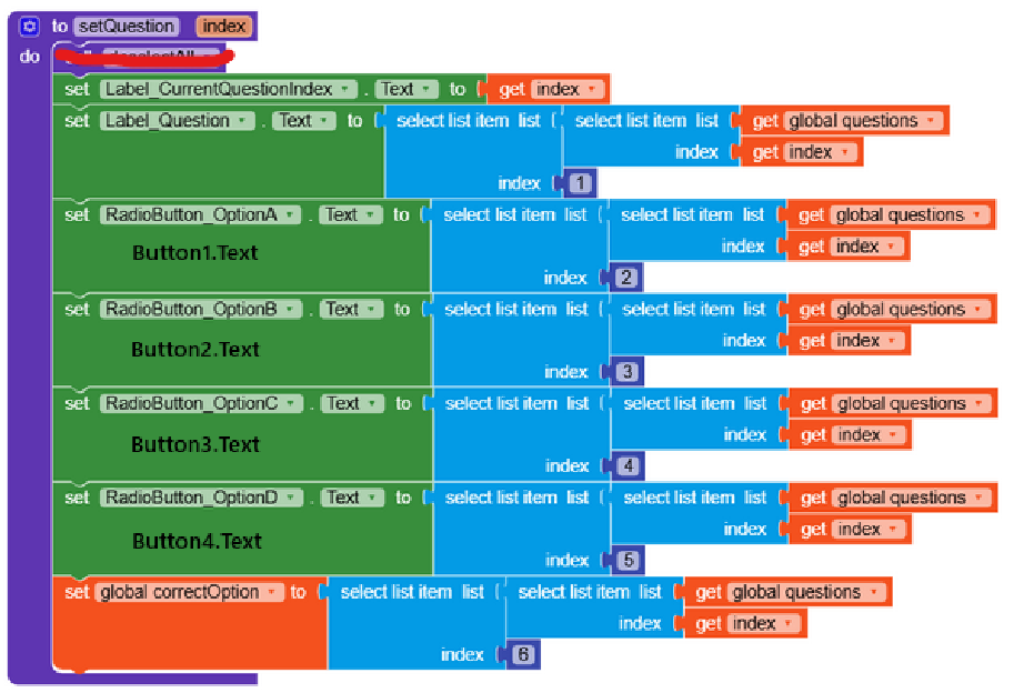 So far, I have created the click event block for the button and added the same blocks you showed inside the Screen Initialize event. However, I am encountering an error, and the questions are not displaying as expected.