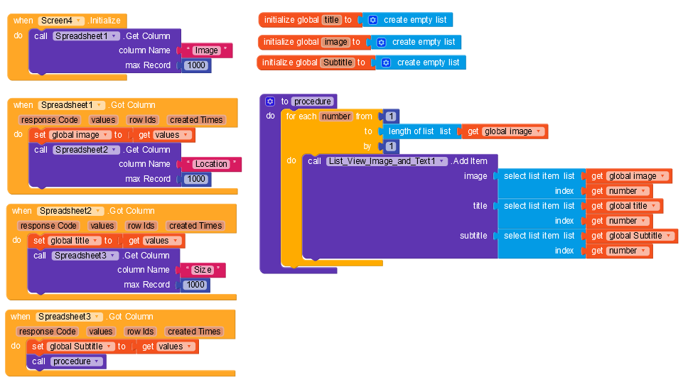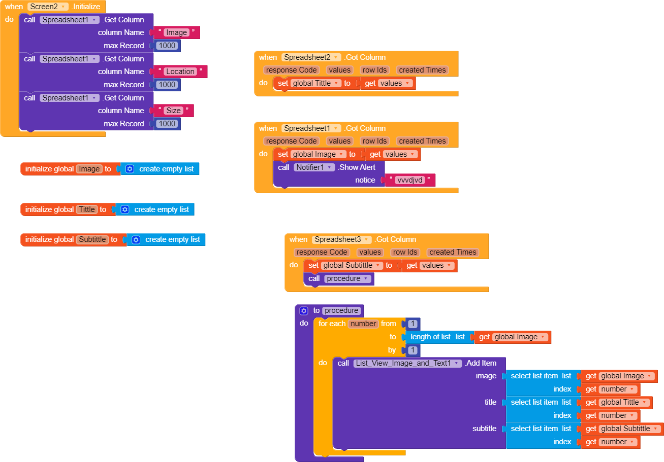 Hello guys am trying to get list view image to get data from spreedsheet and its not visible on the app when testing kindly advice accordingly on where i might have gone wrong below are my blocks thanks in advance