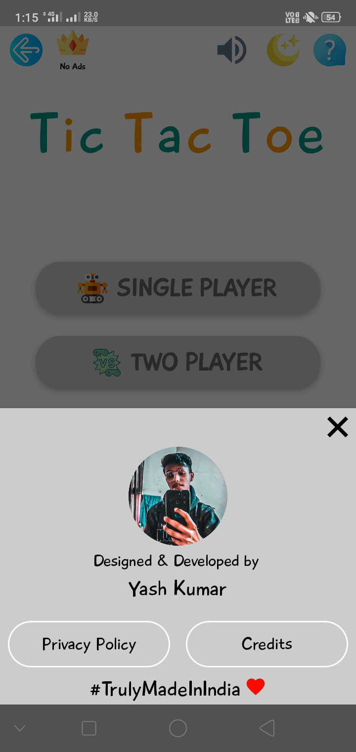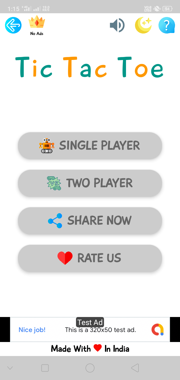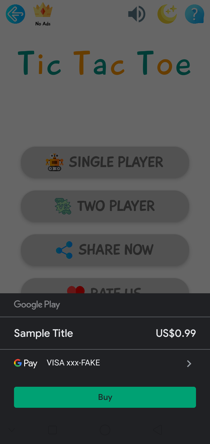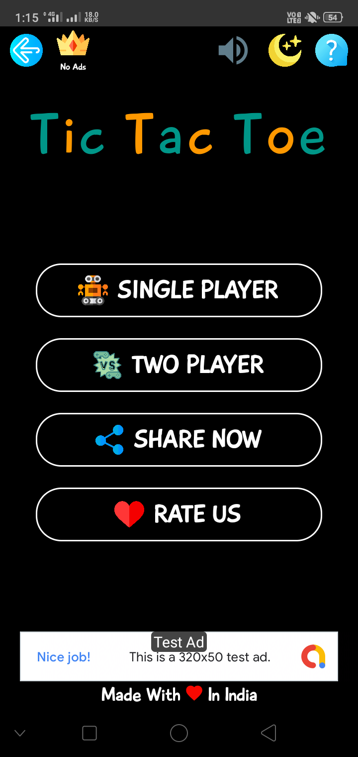 Two mode - single player mode ( with computer ) & two player mode ( with friends ) Google In App Billing feature for ads removal Facebook ads are approved ( can use admob also ) Two themes are available - Night and Day mode for eye protection Beautiful user interface