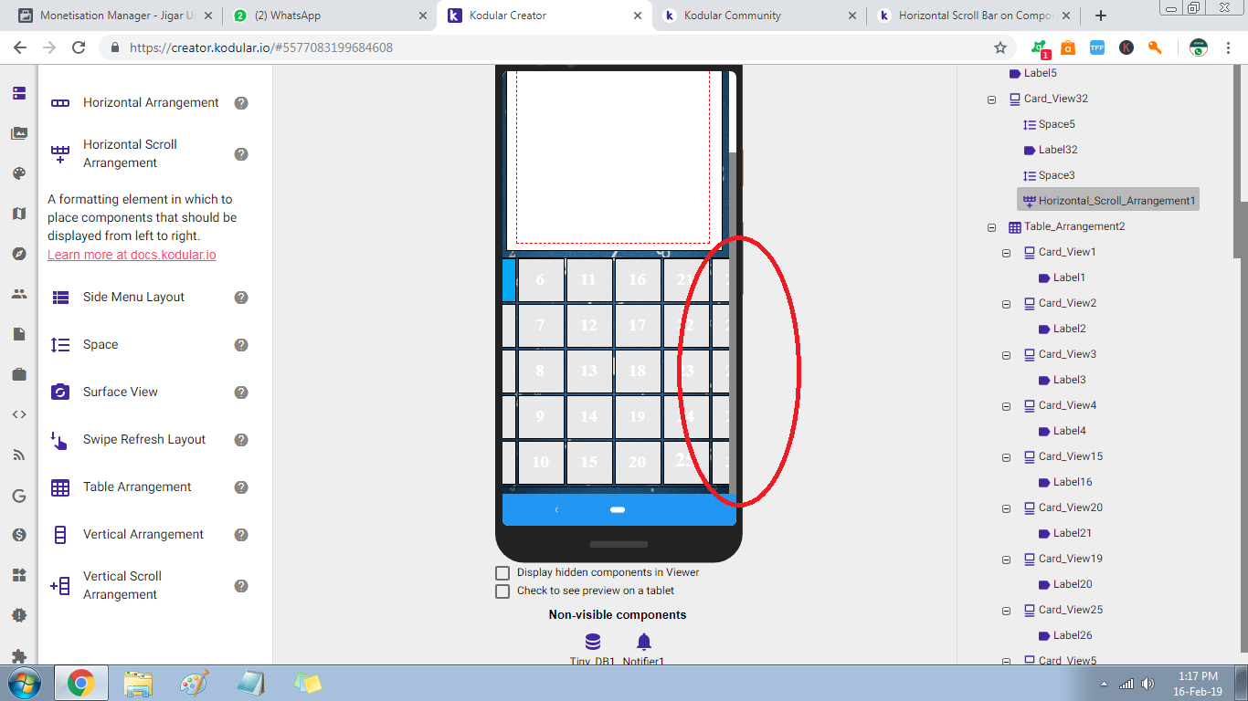 in my app i use horizontal scroll arrangement but after some components add face me problem to arrange components