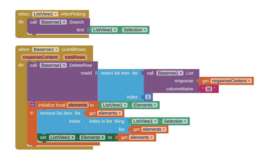 I used this to delete a record with the help of view selection index. In this case id’s were the same. Blocks are from App Inventor.