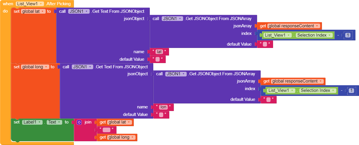 You have to get the values of “lat” and “lon”. Use JSON Tools.