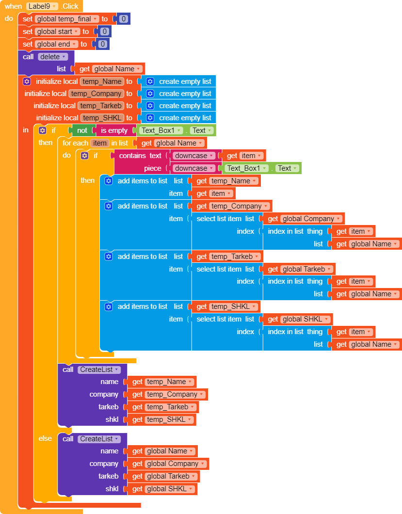 So once search complete, set the clock to timer meanwhile set the newly created temp variable to length of any temp list, set start to 1 and end to if global new temple list to less than 100 then get templ variable else 100 and use create list block by changing all into temp list name also set new clock to timer.