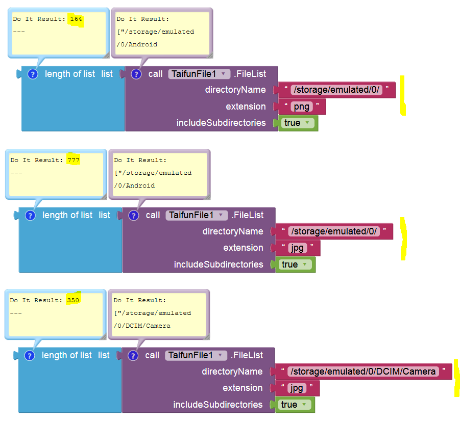 see also the Example App “Test FileList blocks” on my webpage App Inventor Extensions: File | Pura Vida Apps… and if you like to get all images of the internal (emulated) sdcard of the device, you might want to use an empty string for the root directory