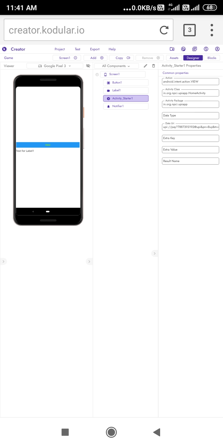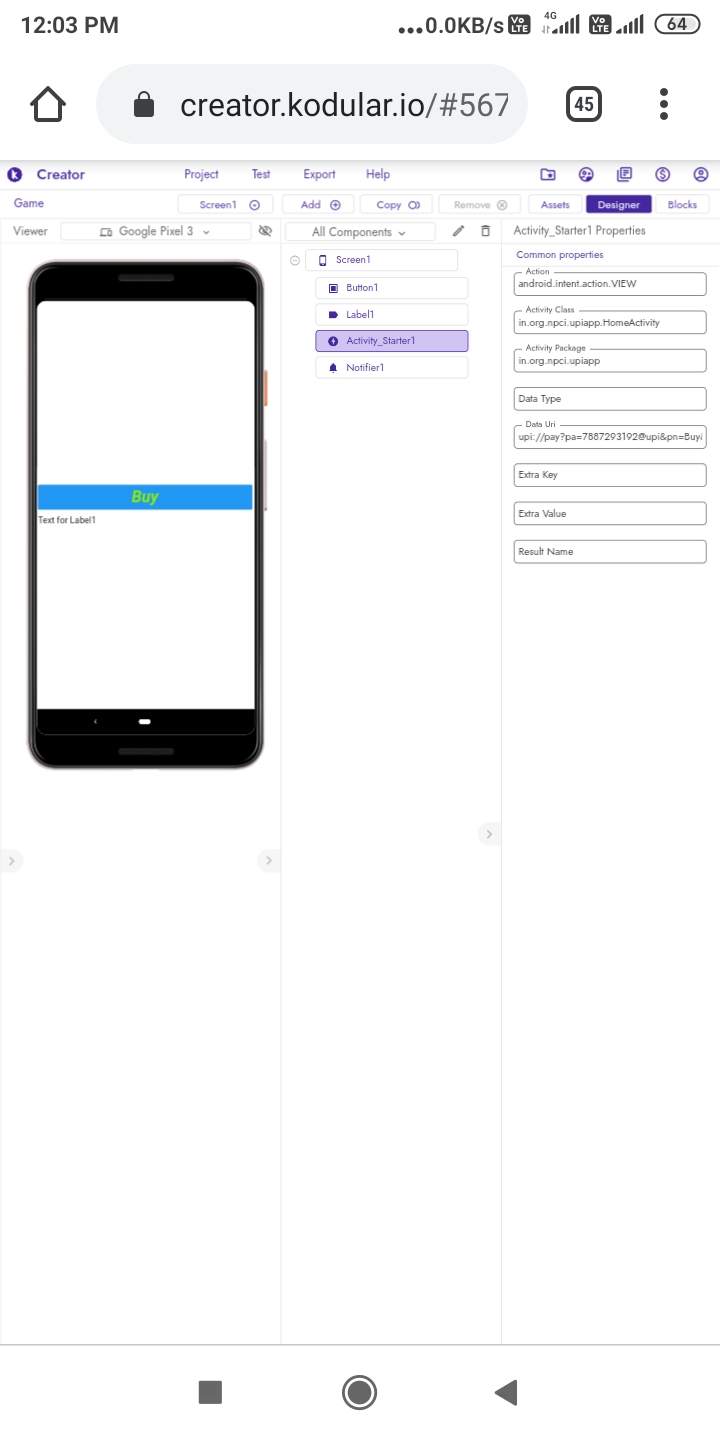 Using Activity Starter component, I am applying Bhima UPI payment system in the application, but the result does not come after the activity
