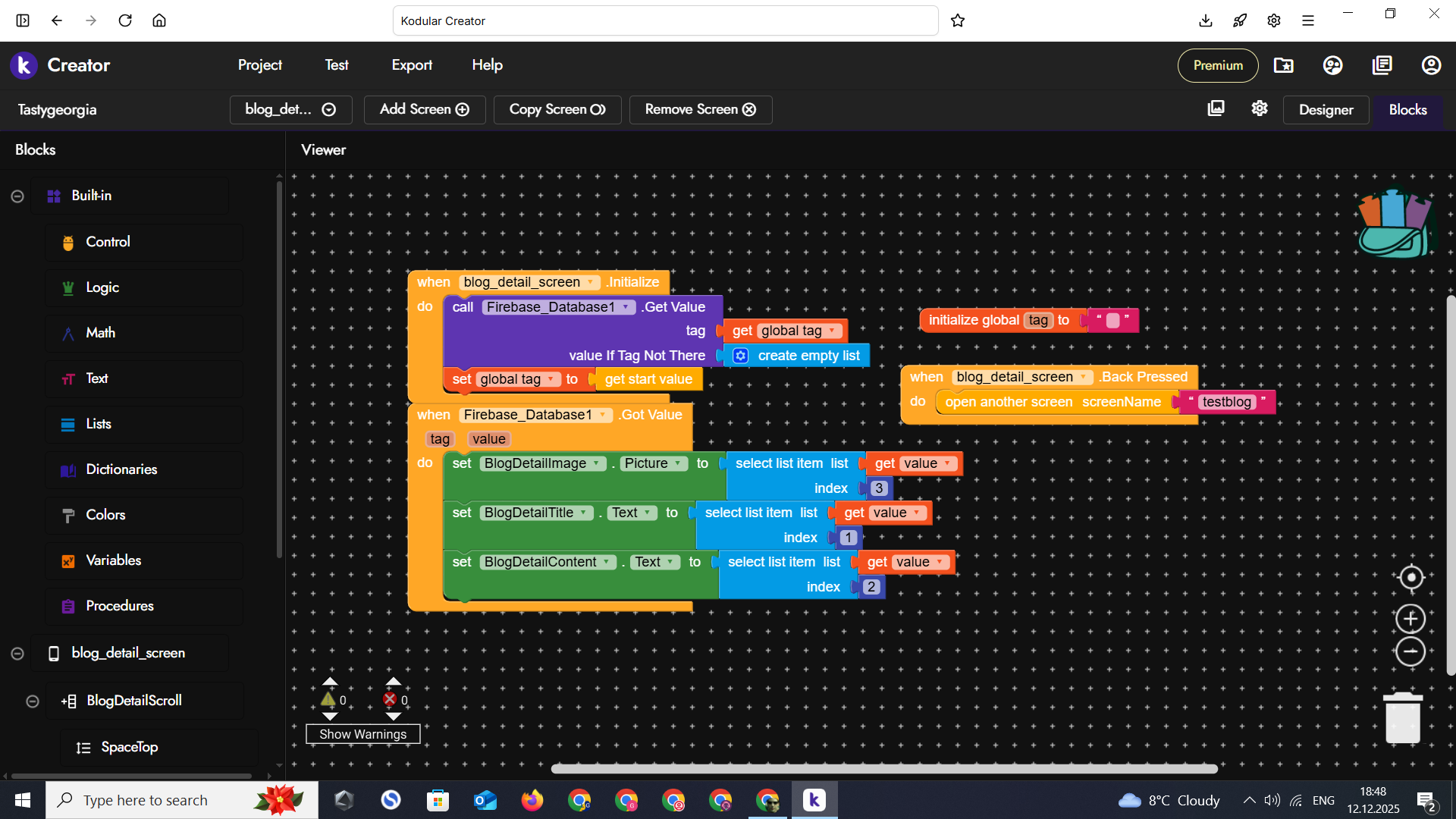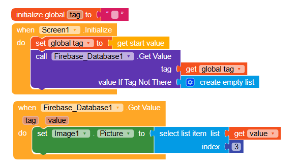 So now it is working , Go on with image component now. Just add the previous block such as set image picture to select list item list (get value} index (3) in the firebase got value event block above or below to the exisitng set blog detail text