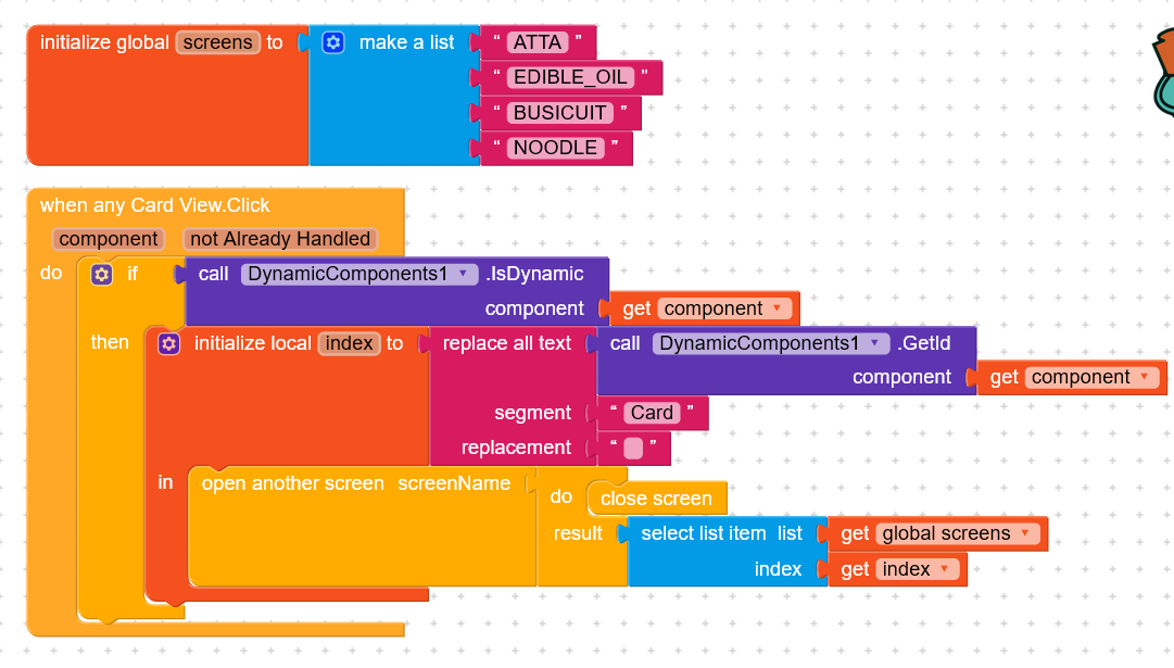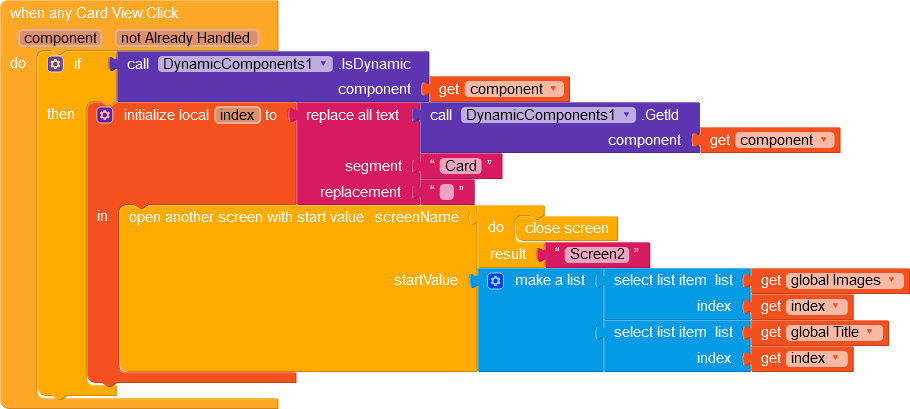 Can anyone tell me how to make clickable items in card view in this aia. I have to add clickable elements to the next screen So how can I do it? In this aia file, dynamic components view is taken.