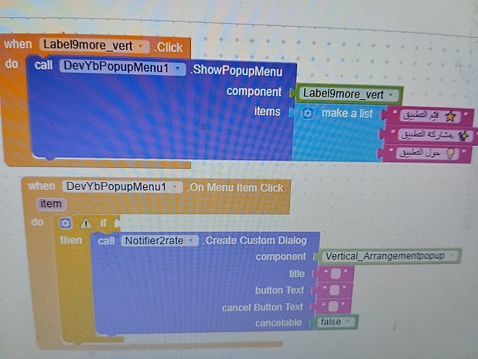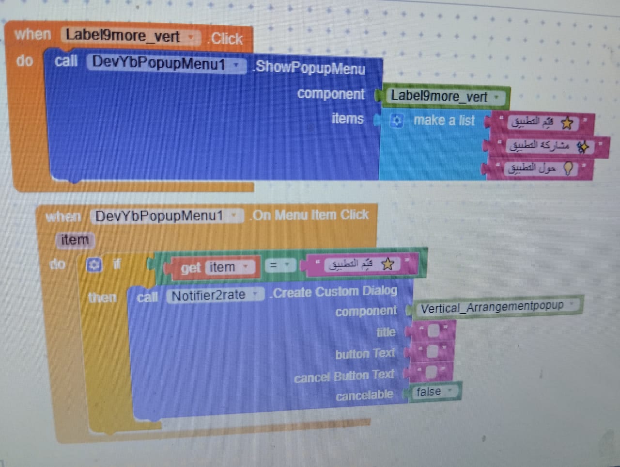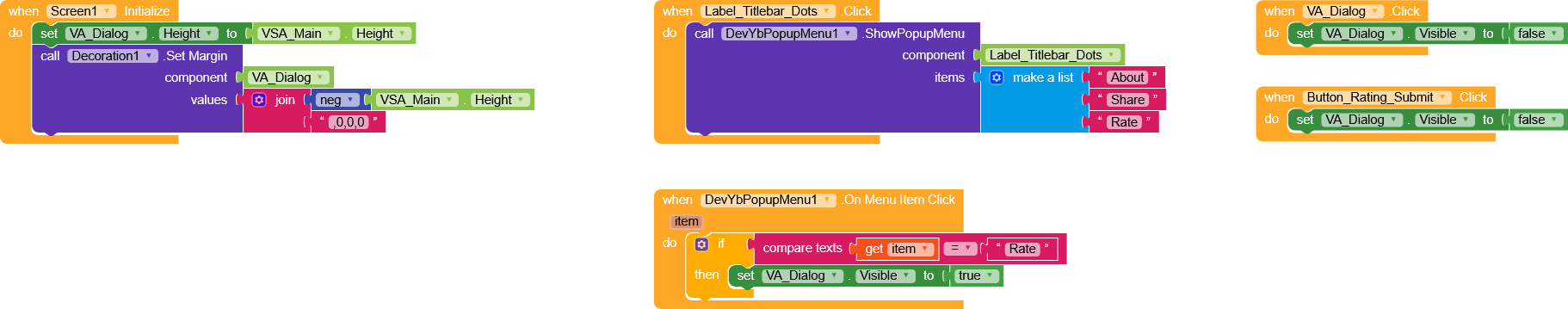 These are the blocks for when the user clicks the three dots, showing “Rate the App,” “Share the App,” and “About the App.”