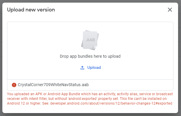 You uploaded an APK or Android App Bundle which has an activity, activity alias, service or broadcast receiver with intent filter, but without ‘android:exported’ property set. This file can’t be installed on Android 12 or higher. See: Behavior changes: Apps targeting Android 12 | Android Developers