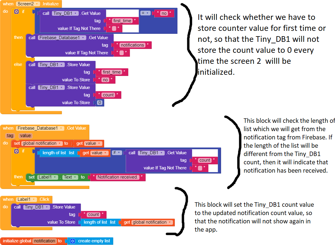 d) After getting the notification list from the Firebase DB, we will compare the length of the notification list with the count which was stored in the Tiny DB. If the count value in Tiny DB will not be equal to the length of notification list, the label will show that the notification has been received.