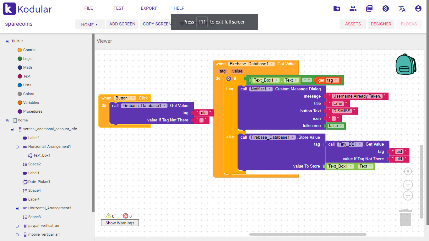 NOTE: i had put firebase auth (google) in another screen, uid is the google user id. i had stored that id in tiny db with tag uid.