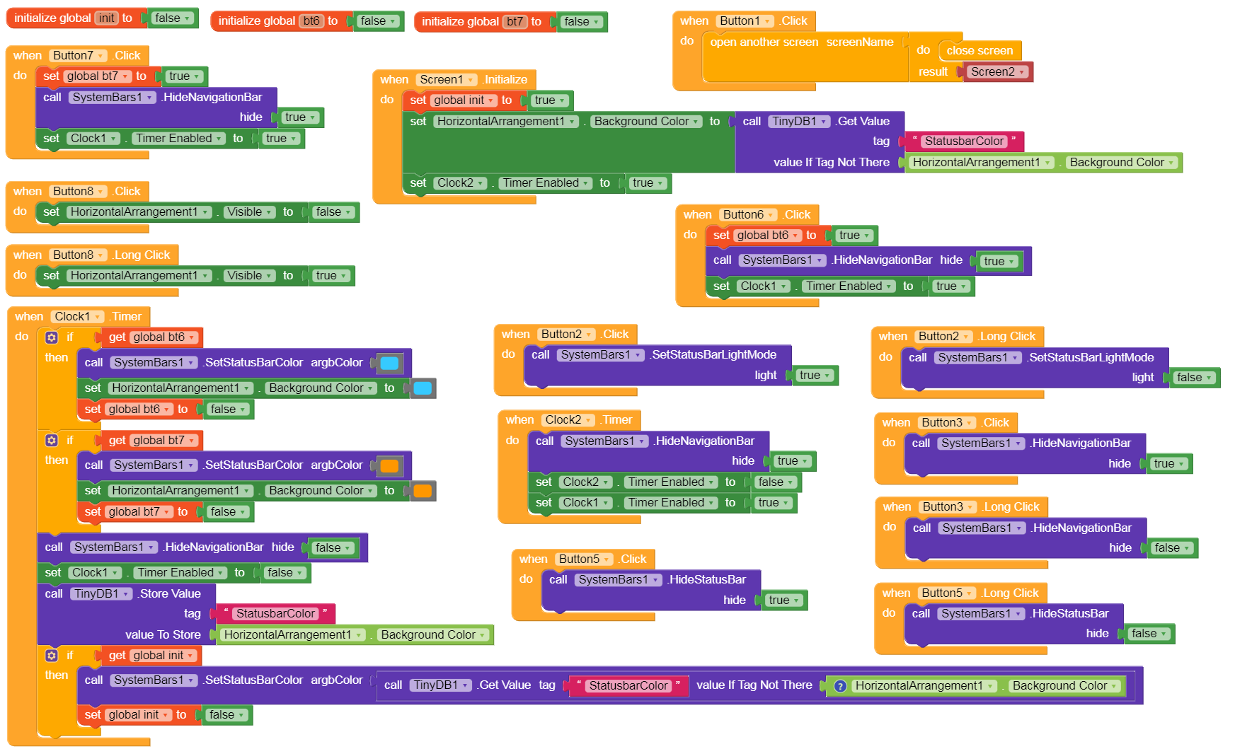 The SystemBars extension is still in an experimental stage. The Status bar and Navbar can no longer be colored independently of each other since the targetSdkVersion=35 update. My extension uses a workaround/trick to prevent the Navbar from being colored. To do this, the navbar must be temporarily hidden for a few milliseconds to prevent coloring. However, this requires that the Title bar is hidden (in the Designer). If desired, this should then be created manually via a HA and colored accordingly (if desired).
