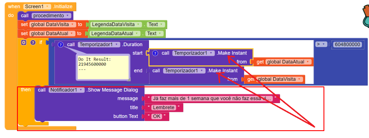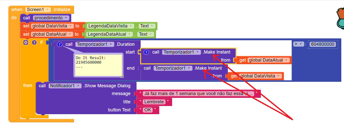 It works . You have to put in duration start → Global DataAtual , end Global DataVistita then it is > 604800000 else it is false and no notification shown. Otherwise you have to add an else if statement and call a notifier with another message in case your argument is false.