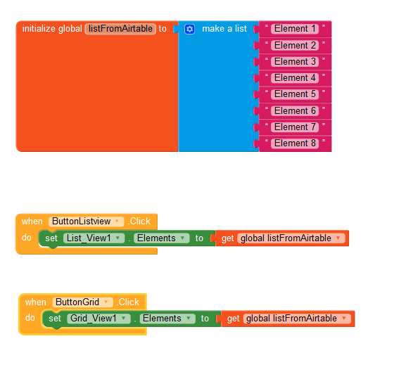 Listview works with lists. So does the Gridview. Just put the list of Airtable in the Elements block and that’s it.