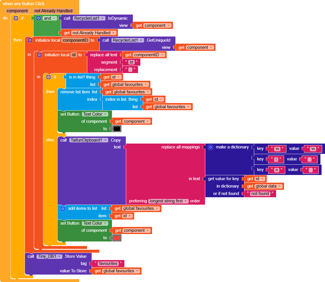 When I click on that button, the button color changes from blue to red, and it gets saved in TinyDB — this part works fine.
