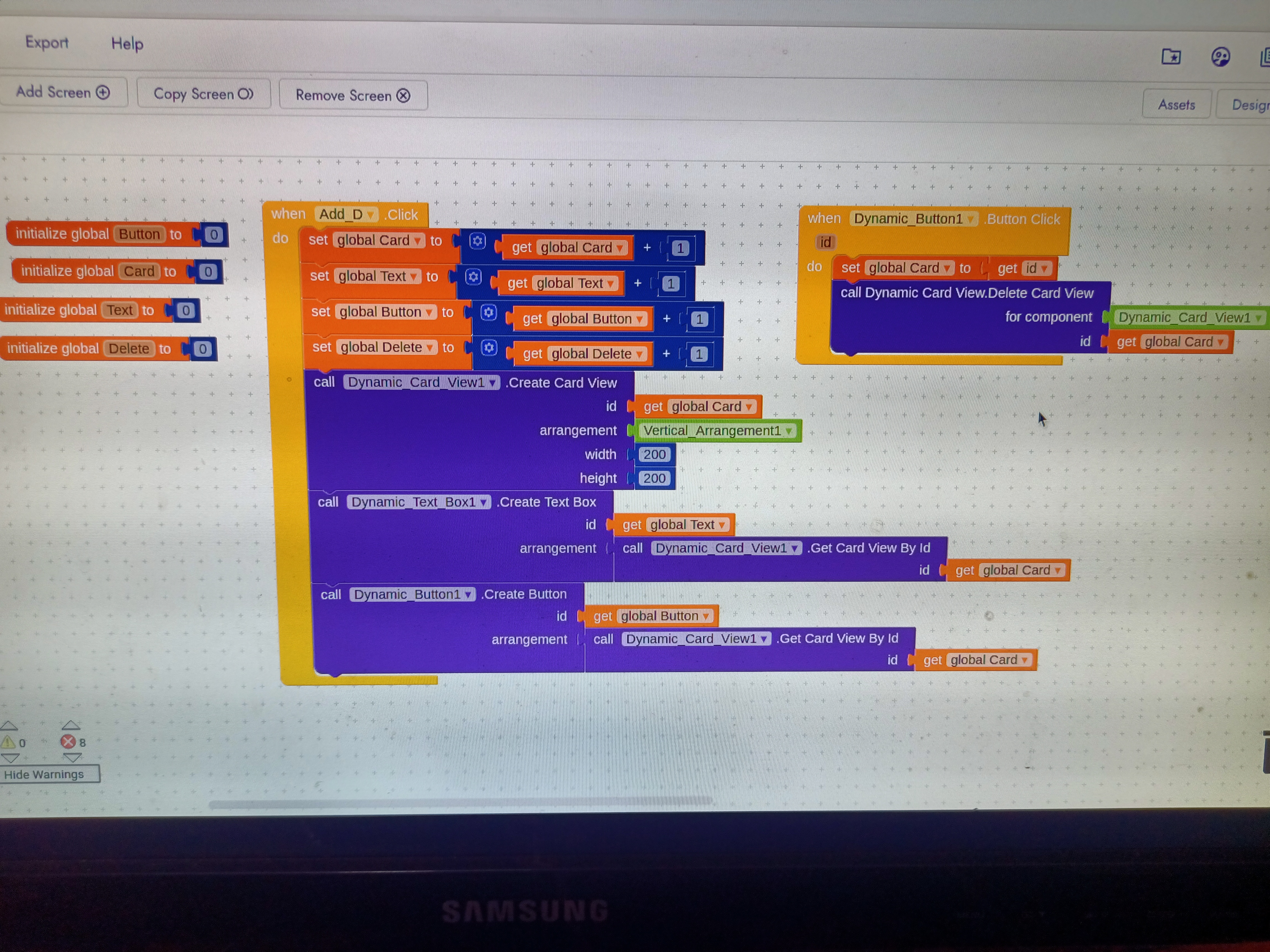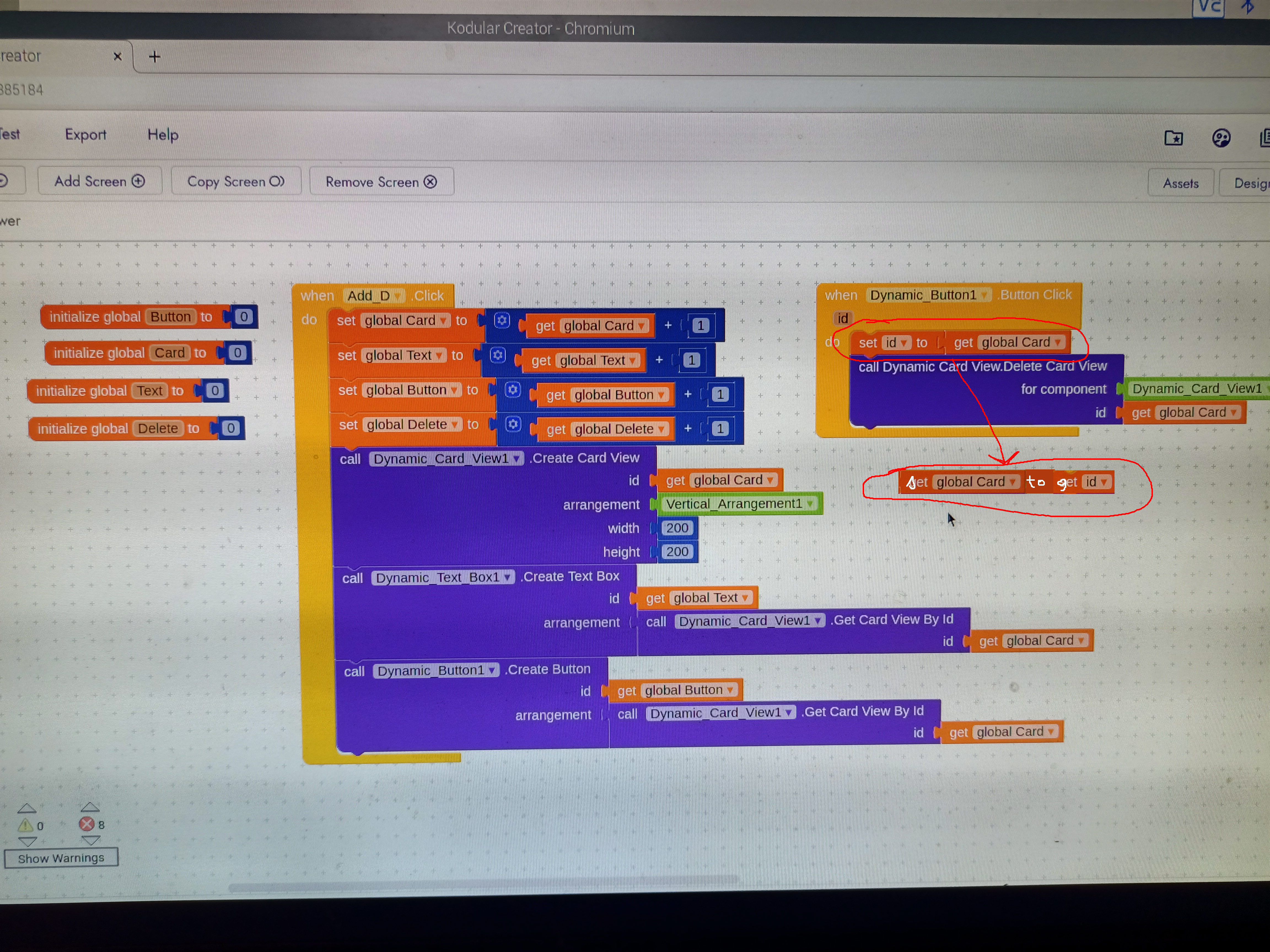 I wanted to delete that particular card view whenever dynamic button inside that cardview is pressed. Can anyone have suggestion about how i can do that? Remember i have unique id for dynamic cardview and for dynamic button whenever user click on Button1. HERE IS THE BLOCKS WHICH I HAVE USED.