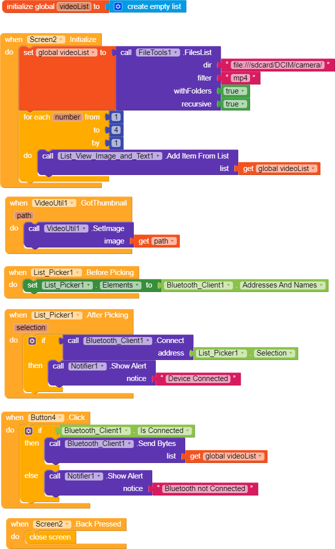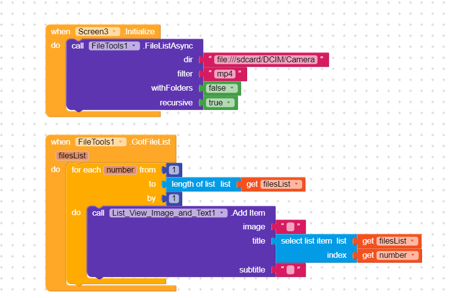 How can i use this blocks for extracting device storage videos in a list view image and text?any other blocks needs besides this blocks?please help me..