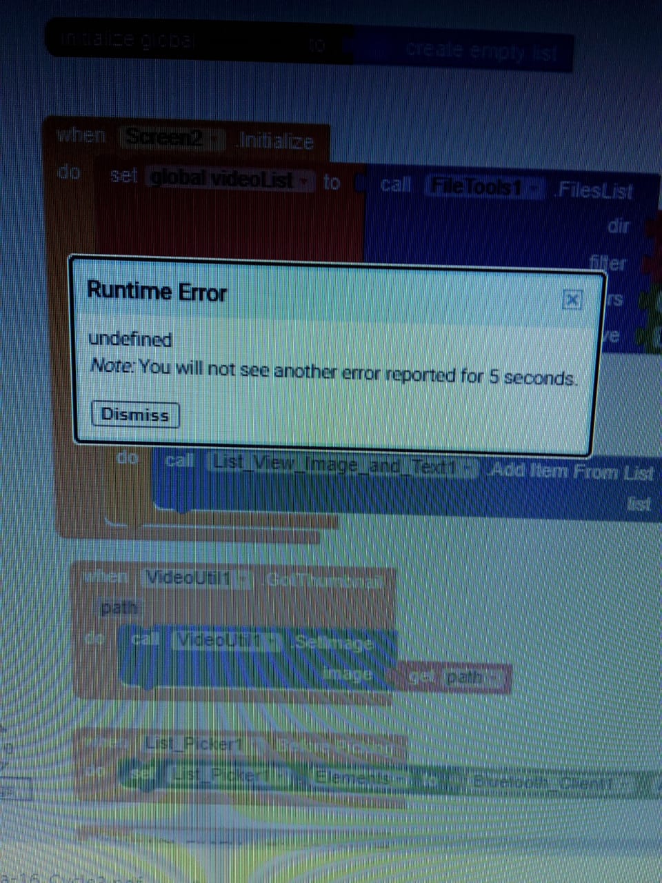 I use filetools to showing device sd card videos in list view image and text but showing error-undefindâŚbelow my blocks and error messege..please anybody help me..