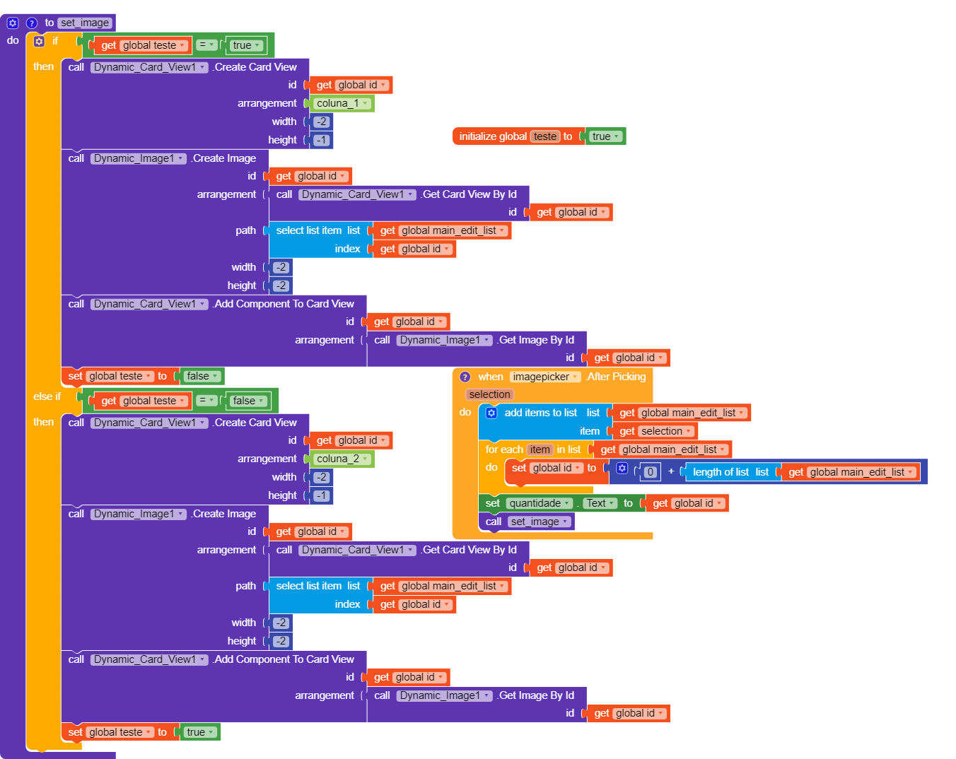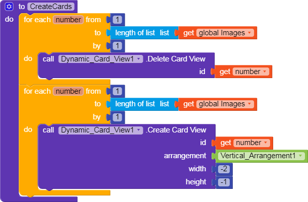 you can see i use the if then block first cause i wanted a double column cardview list. but the secret here is to not use the for each block if you intend to add image manually and not automatically with images you already set at the app development.