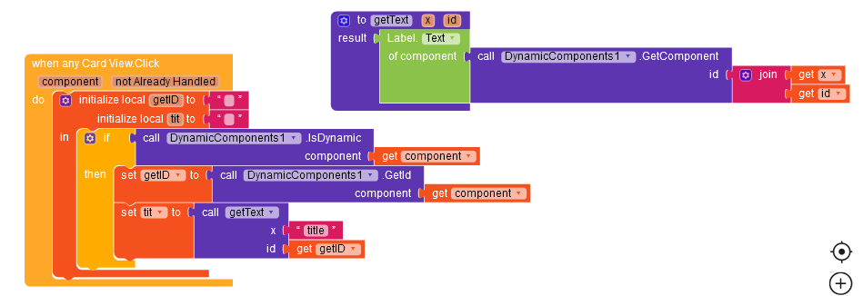 While using card view when i click any card it give me card id only like material card@85742.but couldnt get how to set up blocks to get all label text on that perticular card bcos i m making mcq app so on evry card there are 1que 4options and 1 ans in text value