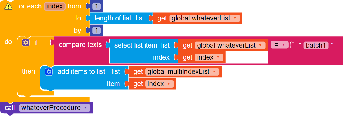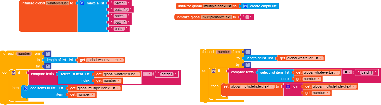 I have a list which has many items and many of them are repeating. I wanted to get the index of all the items that match with “batch1” but when i use the index in list block i get the index of only one item so how can i sort of this problem?