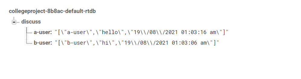 now my problem is, here in the screen shot “b-user” send the message first then “a-user” send message but as firebase is storing data in alphabetic order so they are putting a-user’s message first and if I refresh the app screen a-user’s message is showing first.