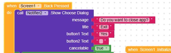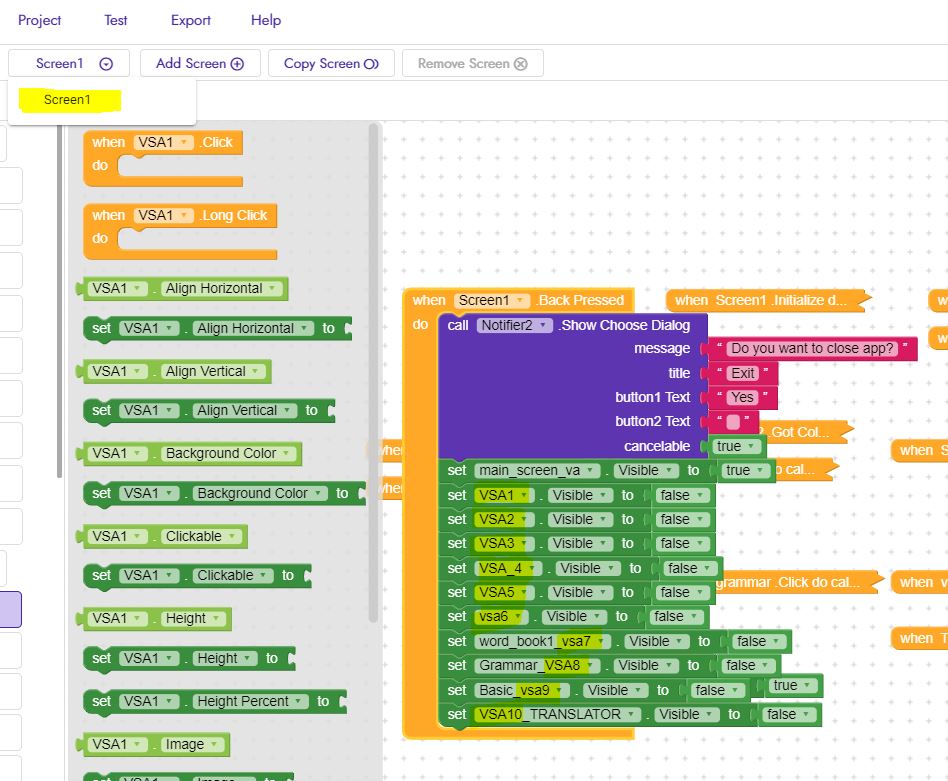 I have only used screen 1 on my app. Inside of screen 1, there are 10 screens (using vertical arrangement and VSA) when i click back from any vertical arrangement screen it closes(like a exit button) the app. so I put do you want to close app button.