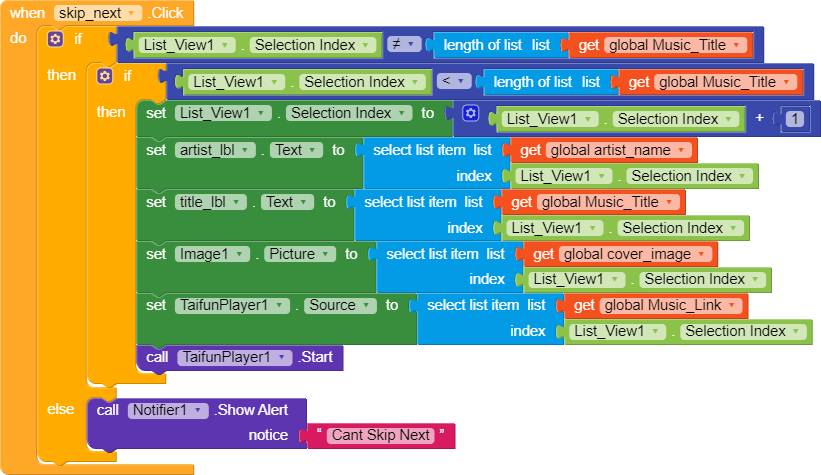 When skip_next is clicked then it will check whether it is in the last position or not. If it is in the last position then it will call Notifier to show an alert that it cant be skipped else it just changes the selection index by +1 and plays the music coming next in the list and changes the artist’s name, music cover, and title.