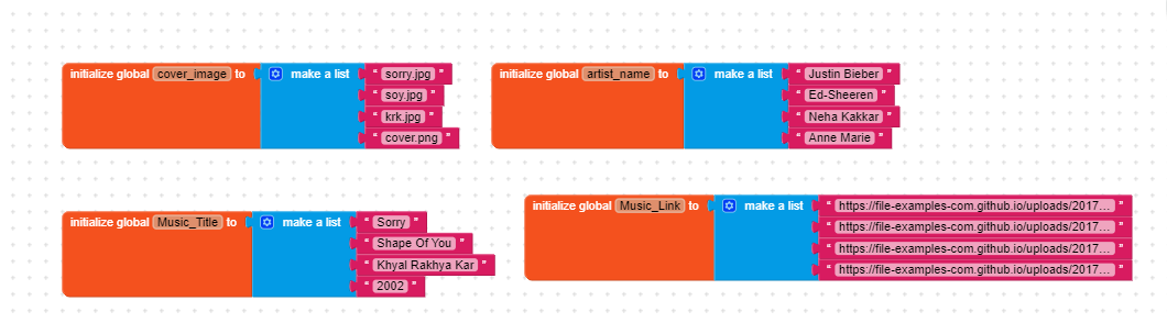 Here I created 4 different variables and stored lists of Cover Images, Music Titles, Artists Name, and Links of the music. You can create these lists from spreadsheets too.