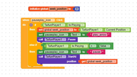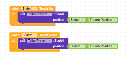 These blocks are very simple. If the slider thumb position is changed by touching to up/down then simply it will call the taifun player to play music from the position.