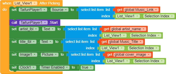 In these blocks, The name of the Artists, Music Title, and the Cover image is set. As well as a clock is fired at an interval of 1000ms.You can set it very low if you are facing problems in showing current timing.