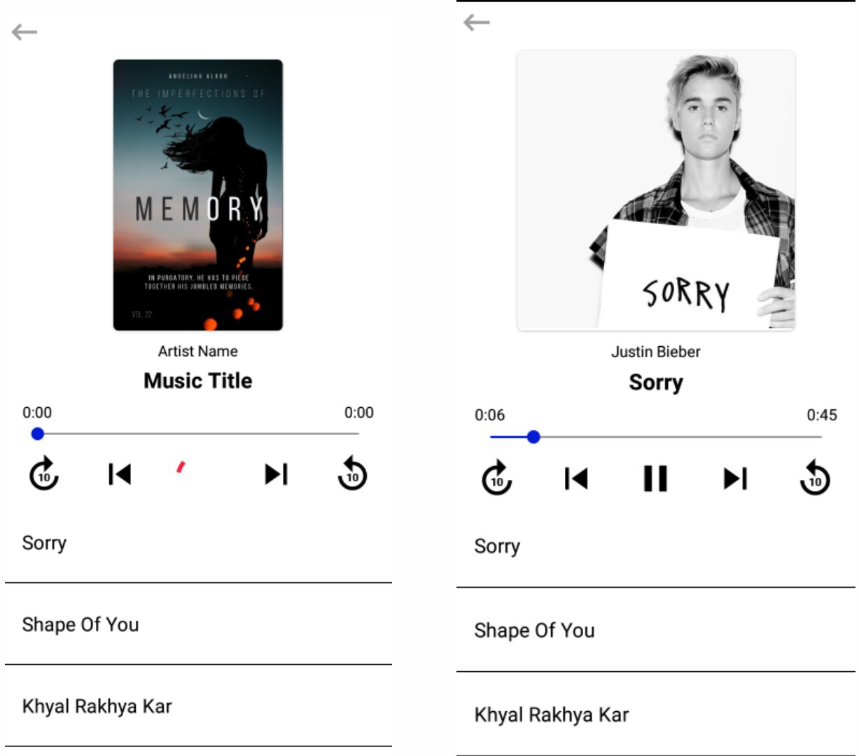 In the main layout of this project, It contains a music cover image, Artist Name, Music Title, Current Time, Total Duration of music, Forward 10 seconds icon, Forward, and rewinds icon, play/pause, and at last replay 10 seconds icon. It contains all the necessary facilities a music player should have.