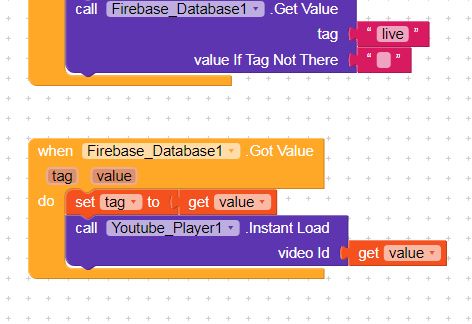 - now in kodular . Use call tag list block then using that tag now use call value block then you will get YouTube url then place that value in youtube player .