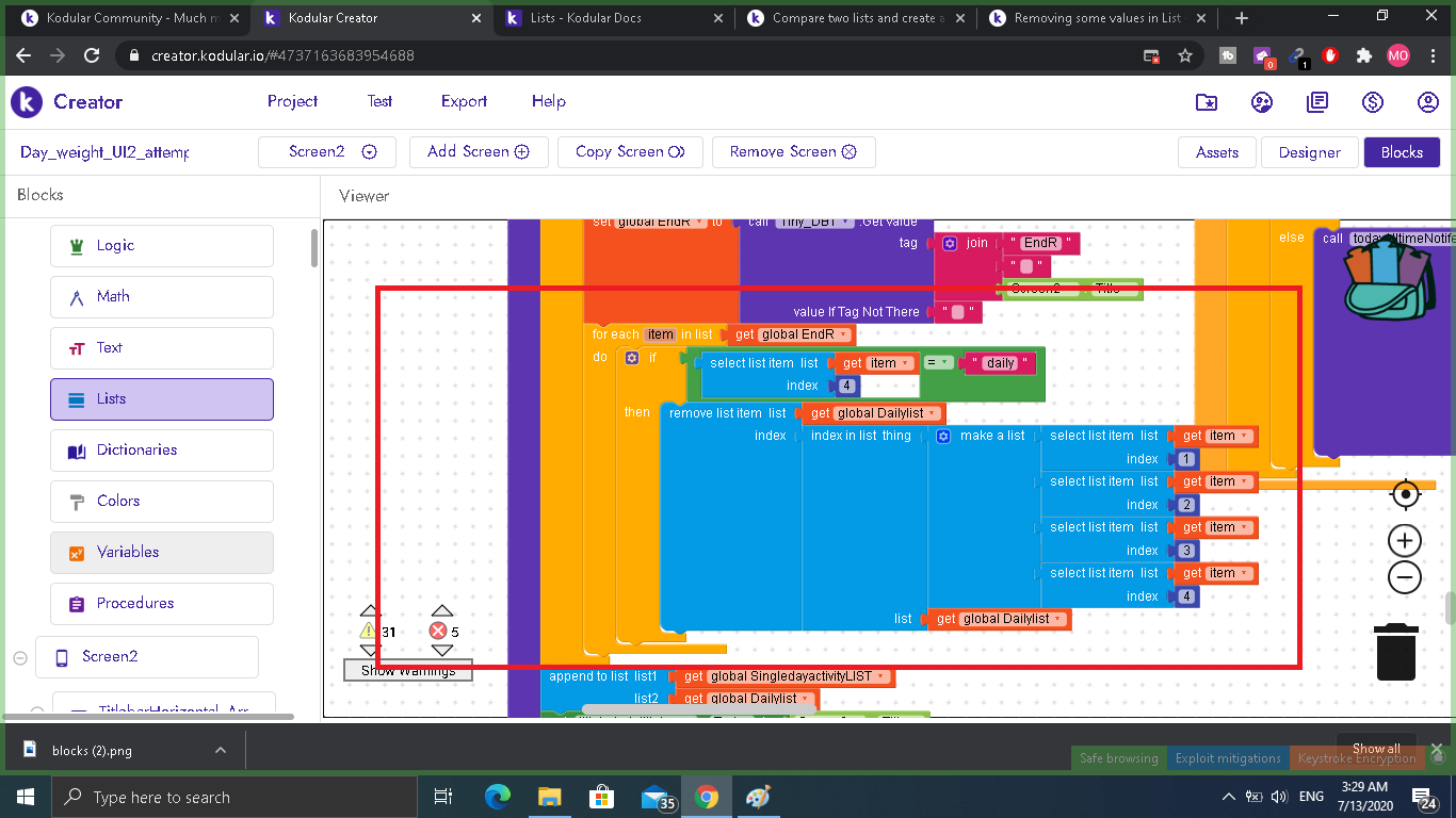 Building a to do list app. I want the user to be able to remove daily activities from a single day only, hence this EndR list which contains the lists of activities that should be removed from one day only. It checks if the item is in EndR and if so removes it from daily list.