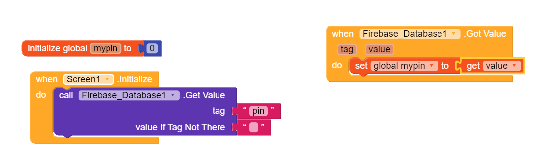As far as I have understood you are going to store your pin in firebase and you want the app to get the pin from firebase… to get the data(pin) from firebase you need to do this