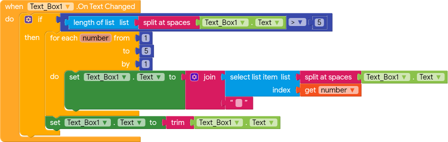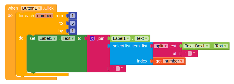 This block makes a list while splitting a sentence assuming words are split by spaces, then glues together the first five words and ads another space between the words
