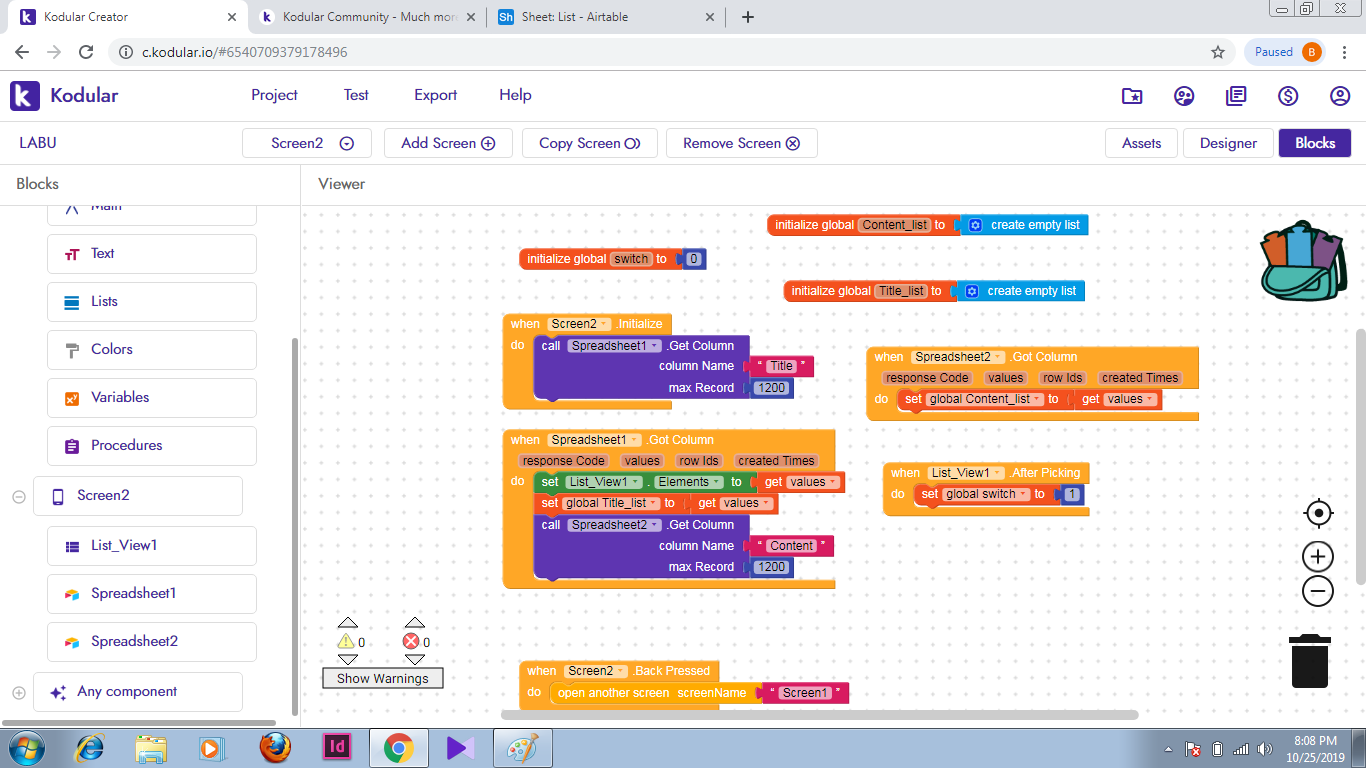 You aren’t setting content values to any listview like in Spreadsheet1.Got Column block.