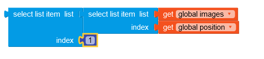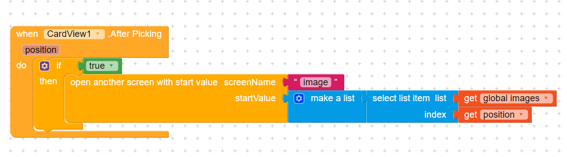 Same as your blocks just remove Make a list from start value, Make after picking Open another screen With start value , Screen name Image and start value , select list item, list global images , index ,get position,