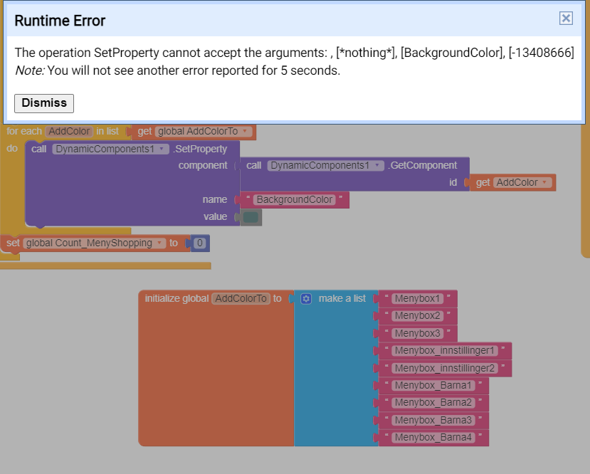 BackgroundColor property of any component accept an integer value as color. Not only background color, all property related color accepts an integer value. But in your blocks, you’re giving a string value to the value parameter. Could you try removing the string from the value? Then try.