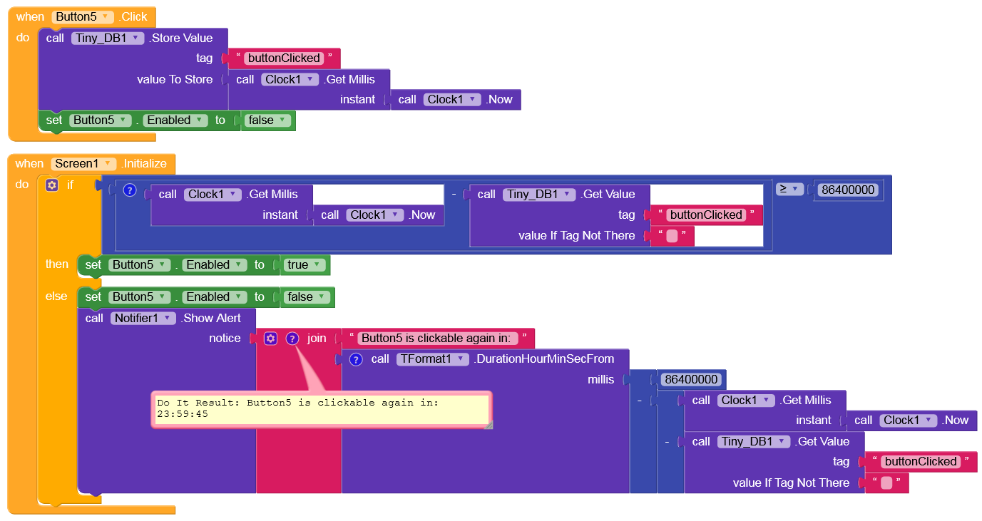 Can somebody help me with disabling a button for one day after being clicked? - Please!