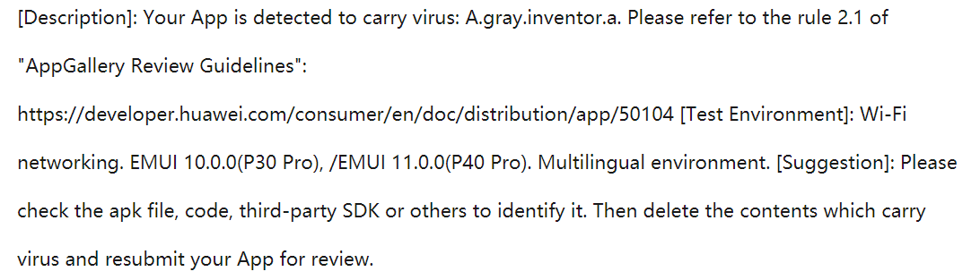 I upload my app on huawei gallery and it was rejected saying that there is a virus. Is there a solution for this problem